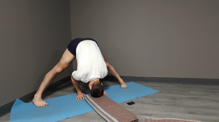 Urdhva Prasarita Padasana III con piernas en pared (2′ cada cruce)