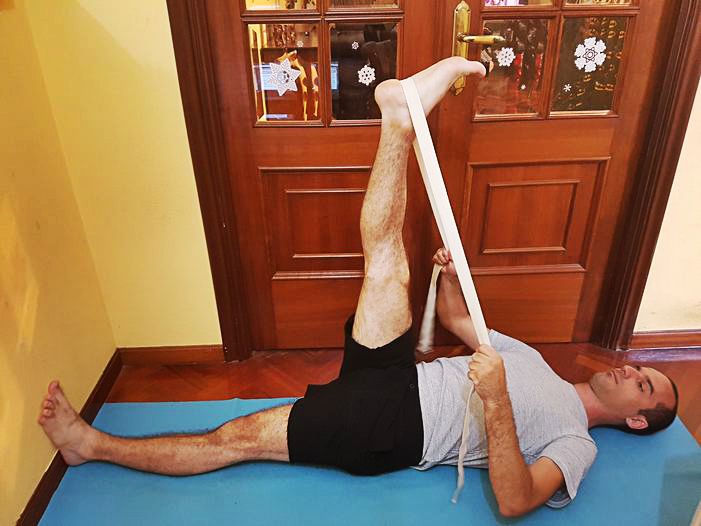 Supta Padangusthasana IDesde la posición de partida coge un cinturón y pásalo por la parte central del talón.