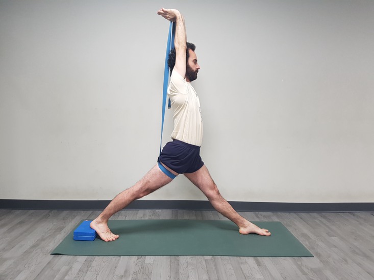 – Ladrillo, giramos bien la pelvis hacia la pierna adelantada, cogemos el cinturón por encima de la cabeza con la sensación de los brazos lo más cercano a la de Tadasana.